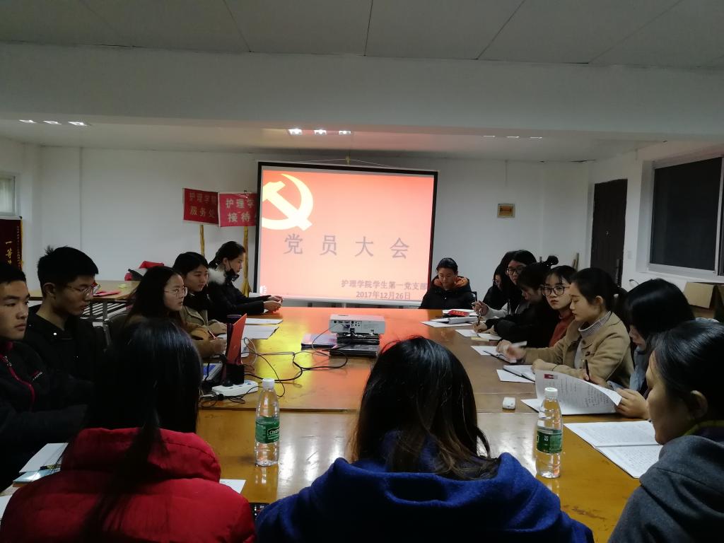 (通讯员苟玲娟)2017年12月26日下午,江西中医药大学护理学院学生第一党支部在护理学院11栋地下办公室召开护理学院学生第一党支部党员大会。本次大会主要讨论余祖林等3位预备党员的转正问题及韦露等14位发展对象转为预备党员问题。护理学院党委副书记刘红、护理学院第一党支部书记宋慧娟、支部委员杨玉婷以及全体学生党员、预备党员参加了此次会议。