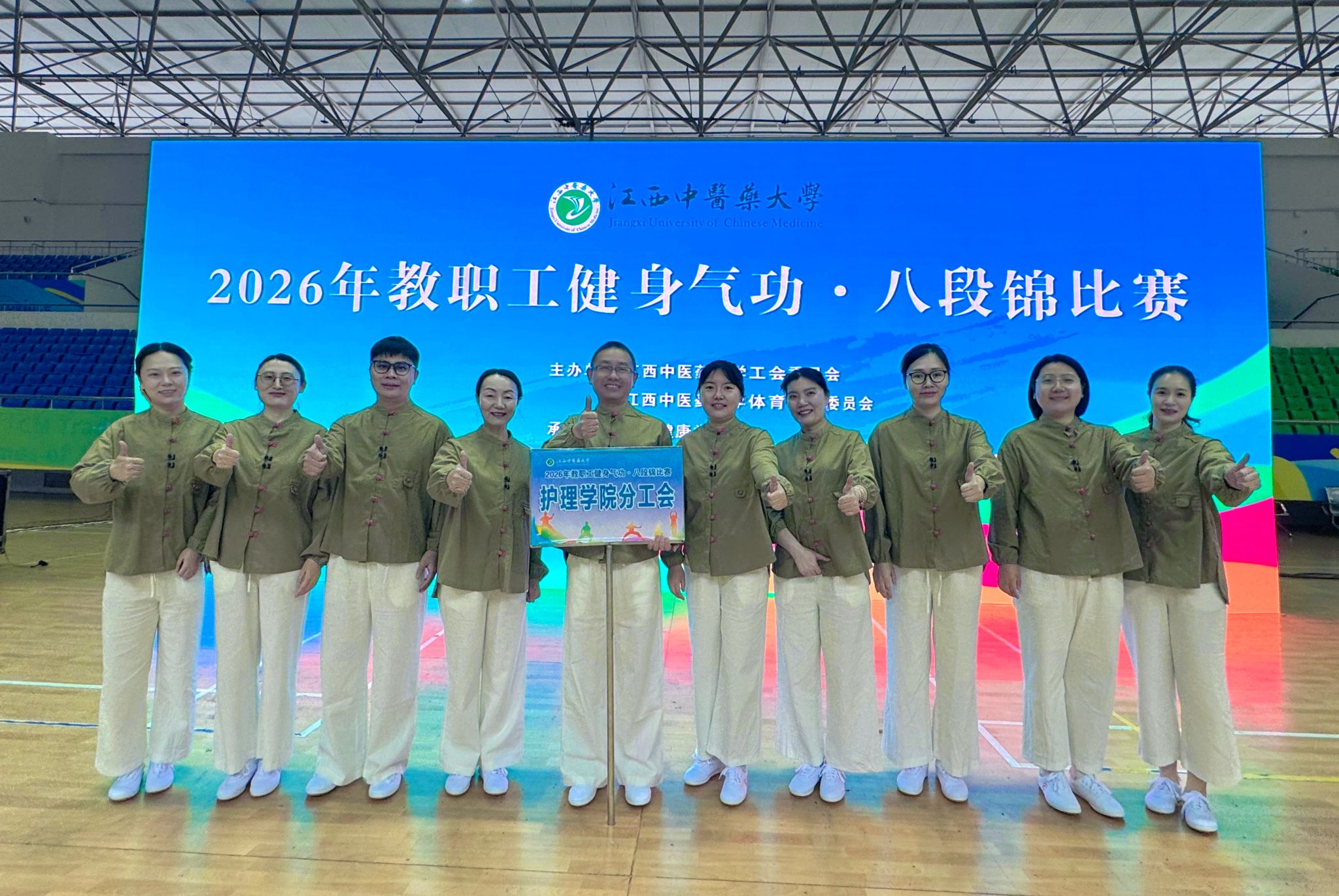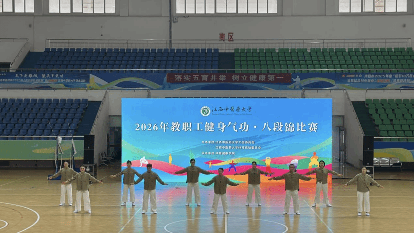 江中新闻网讯 (通讯员 喻思思)为进一步落实 “五育并举”育人理念,丰富教职工文体生活,增强教职工身体素质与团队凝聚力,2026 年 4 月,江西中医药大学 2026 年教职工健身气功・八段锦比赛在学校体育馆隆重举行。护理学院分工会首次组队参赛,凭借整齐划一的动作、昂扬饱满的精神风貌,在全校参赛队伍中荣获比赛优胜奖。